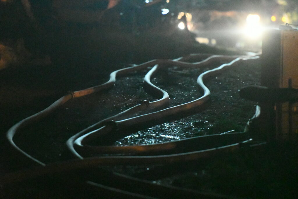Det har ikke været muligt for brandvæsenet at få en kran ind, der kunne vælte konstruktionen, og derfor bliver der tale om en kontrolleret nedbrænding af gården, som indeholder en saftstation..