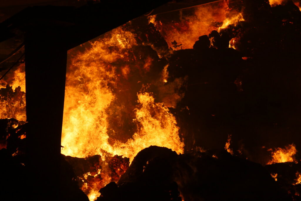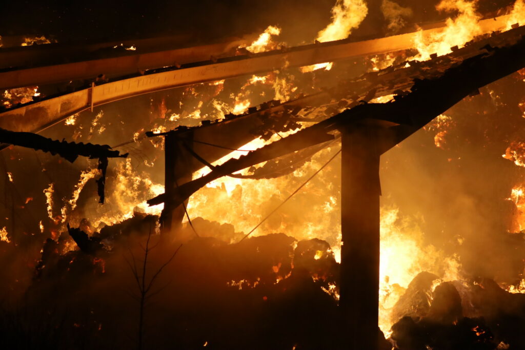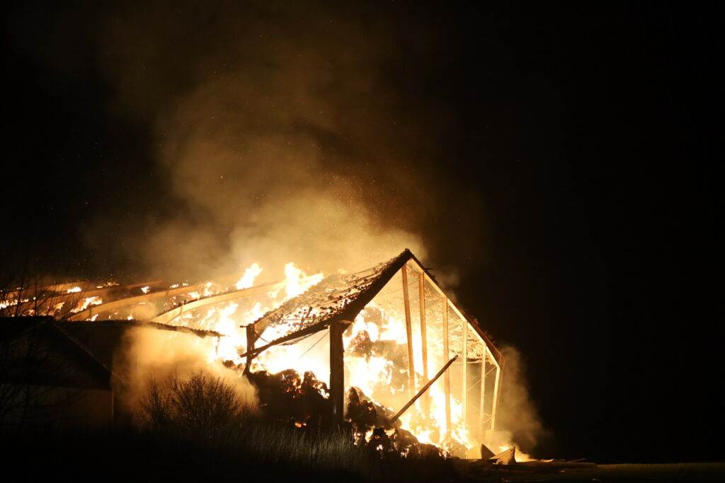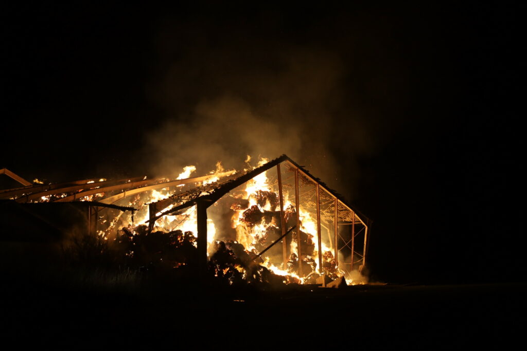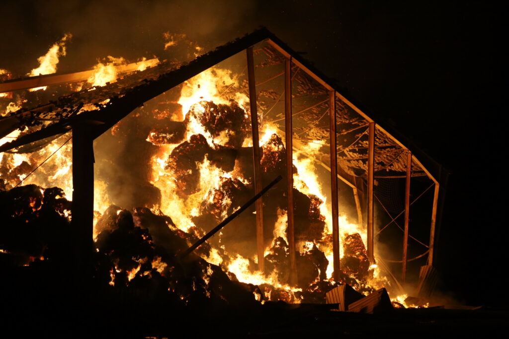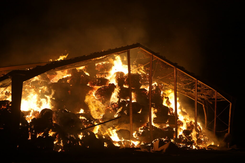 Laden er fuld af halm, og det besværliggøre slukningsarbejdet, da halmen kan ulme længe.