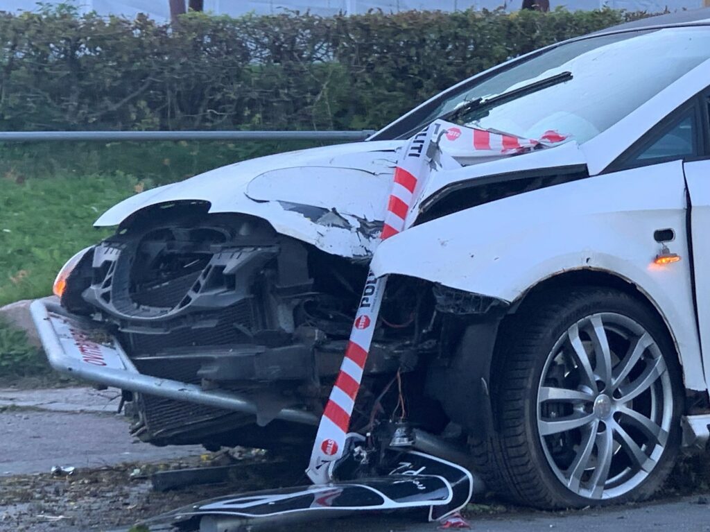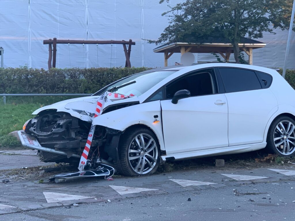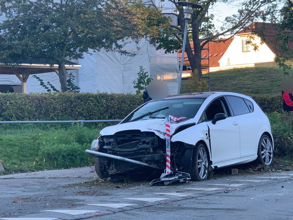 En bil har tirsdag eftermiddag påkørt først et helle og derefter et skilt med høj fart ved boligområdet Vapnagård i Helsingør.