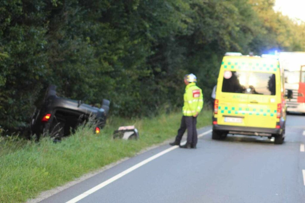 En bil lå i grøften på taget efter et færdselsuheld, og redningsmandskabet var i gang med redningsarbejdet på stedet.