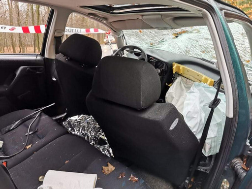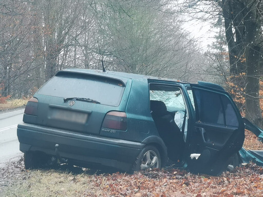 En personbil har påkørt et træ og endte fastklemt med et tilsyneladende brækket ben i følge meldingen på stedet.