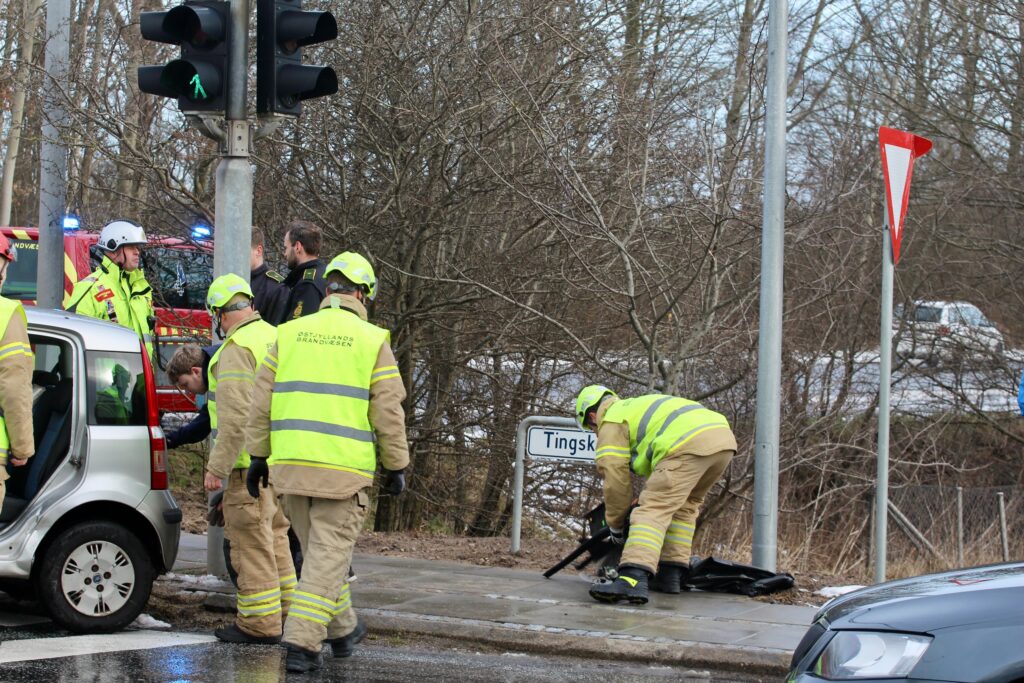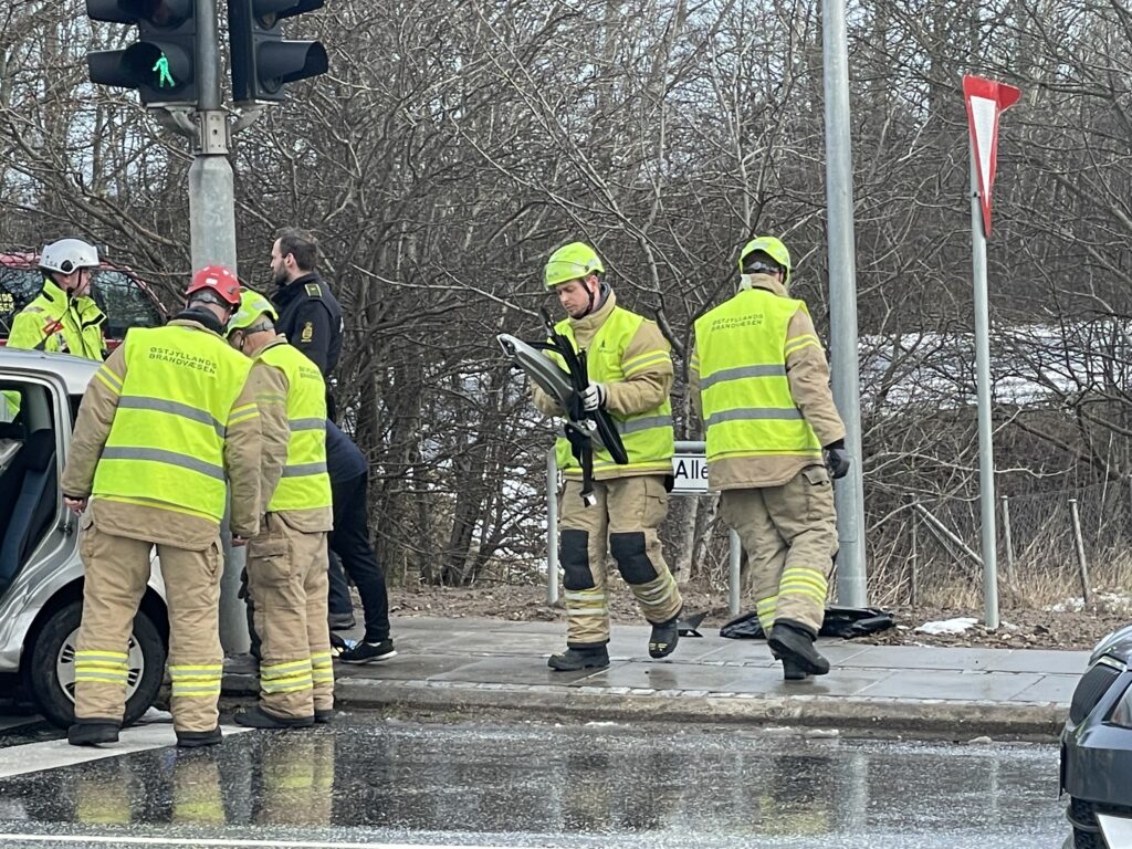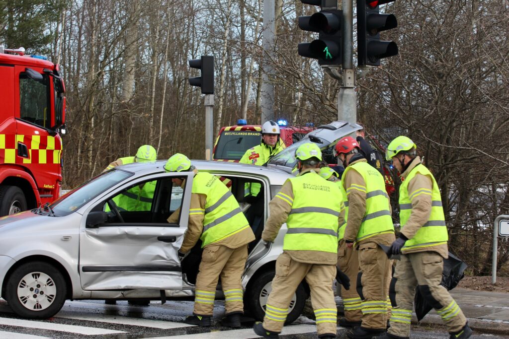 Større redningsopbud er på stedet og bilen måtte klippes op for at få personen fri.
