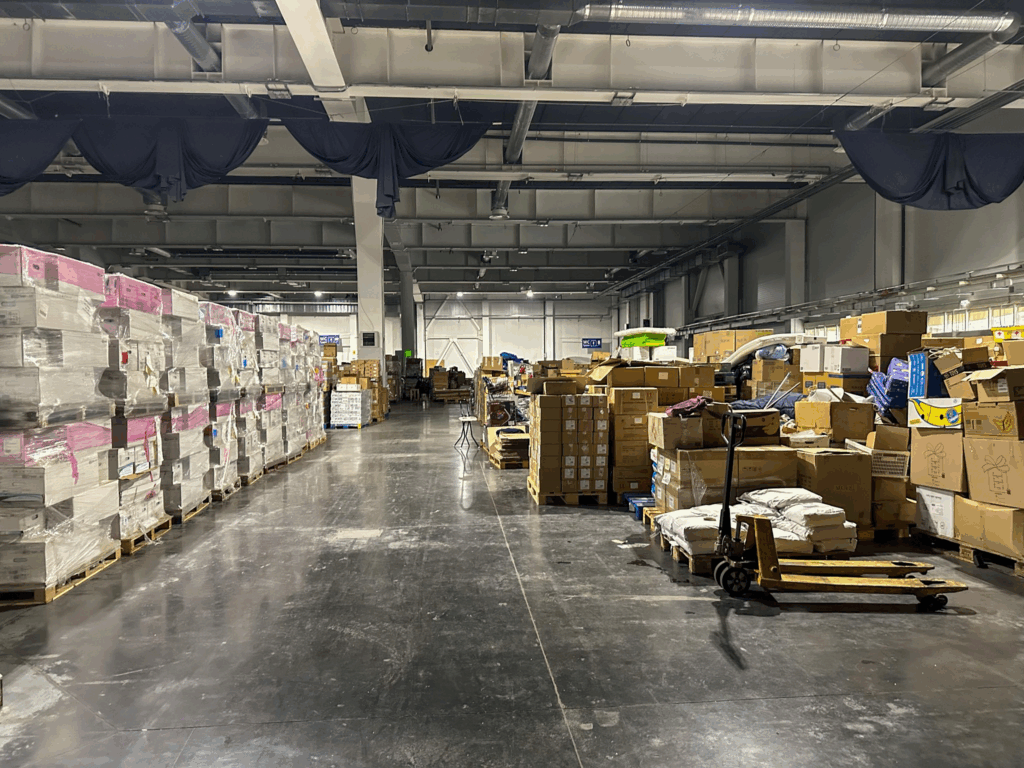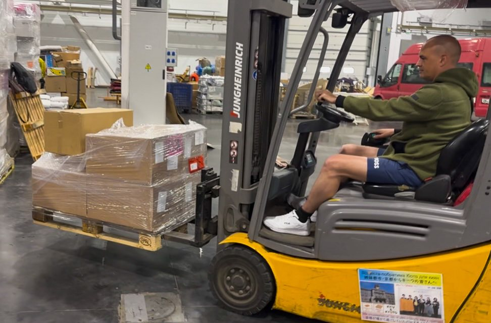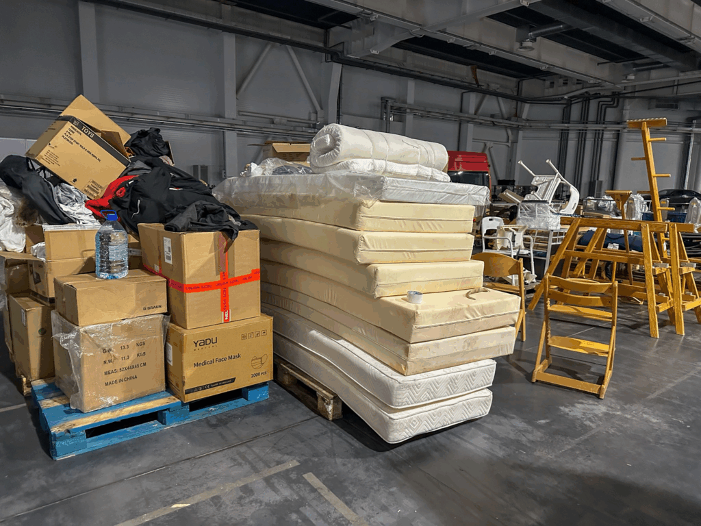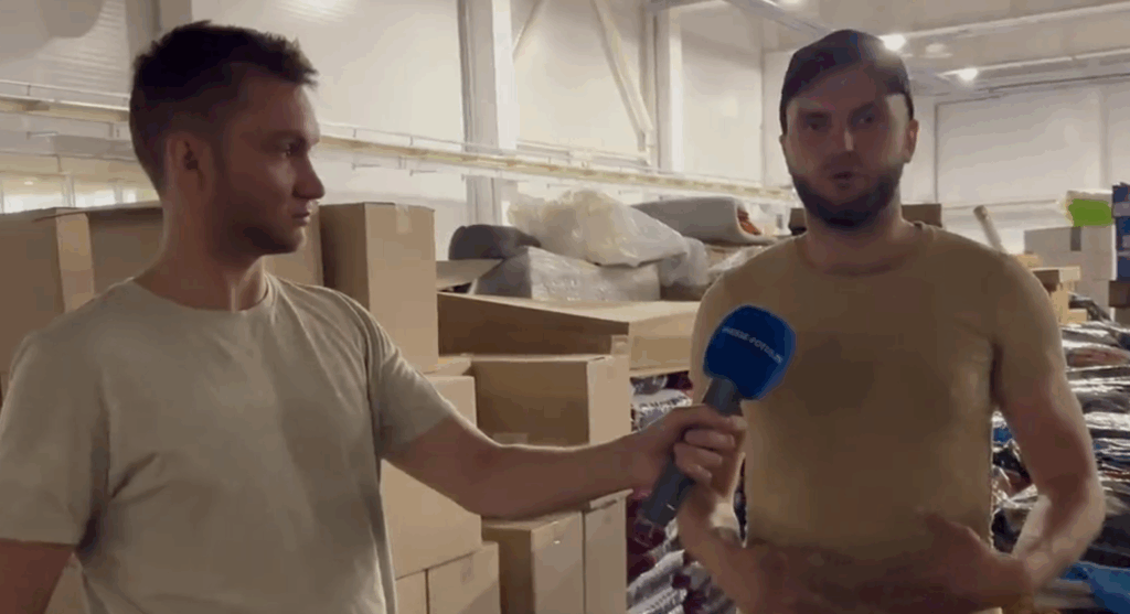 “Vi arbejder her, fordi der samles humanitær hjælp, som vi pakker og sender videre til de mennesker, der har mest brug for den. Det her sted er et lager, et logistisk knudepunkt,” siger Aleksei Kolorev til Presse-fotos.dk og peger på de lange rækker af paller, der venter på at blive sendt af sted.