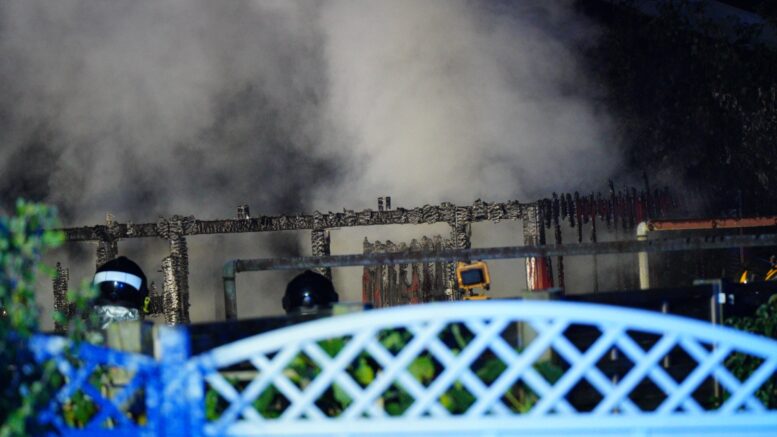 Bygning brænder ned til grunden: Hvid røg stiger til vejrs