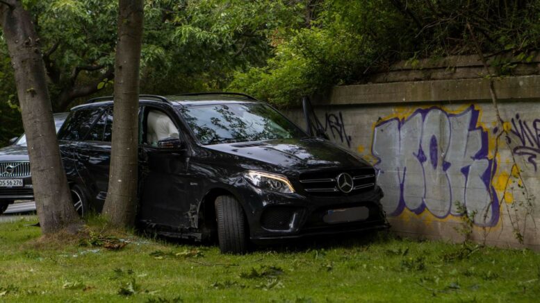Mercedes kørt galt – sidder kilet fast mellem træ og mur
