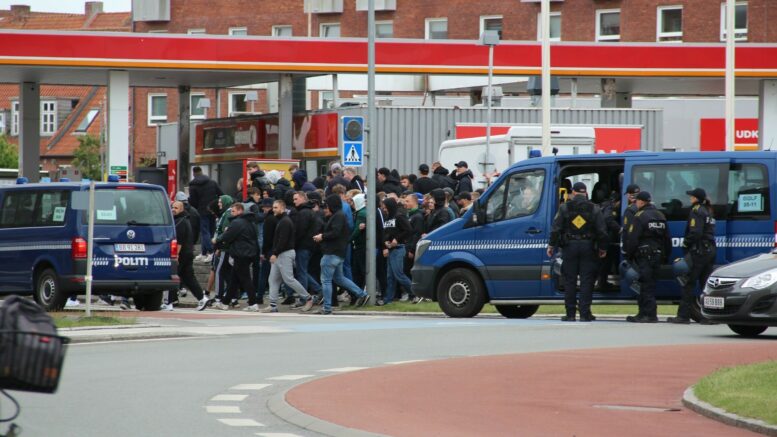 Esbjerg fans eskortes af politiet væk fra stadion ved kampstart
