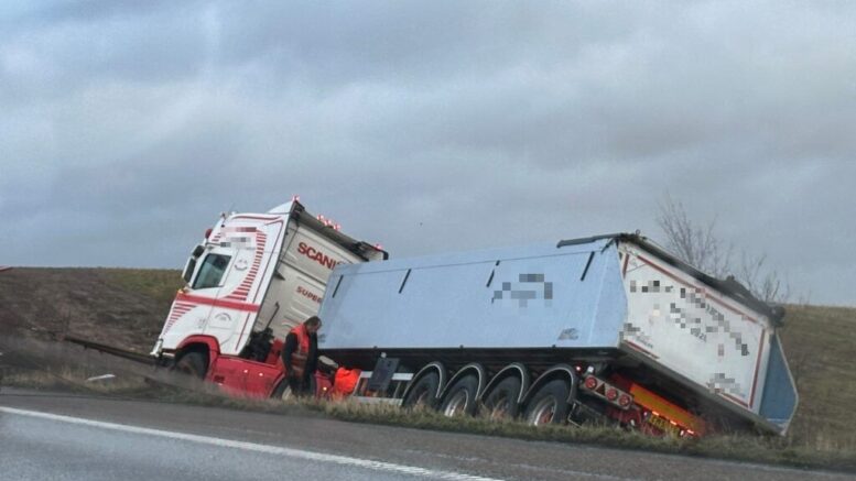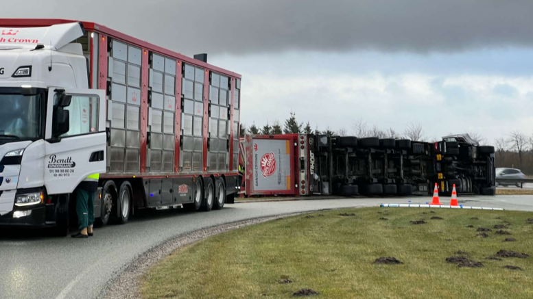 Grisetransport med 210 svin vælter i sving på rasteplads