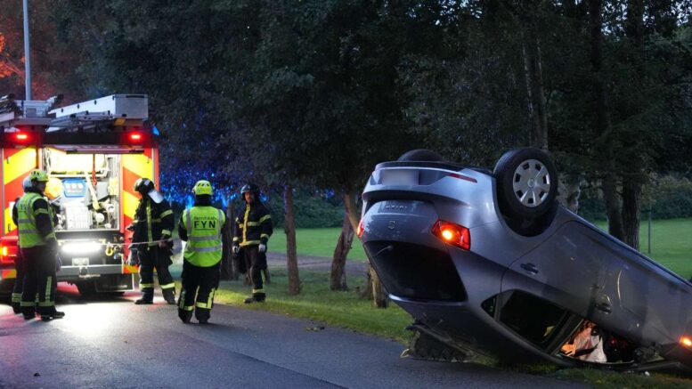 Melding om fastklemte: Bil ender på taget efter hårdt sammenstød