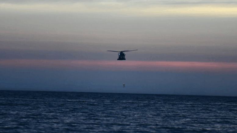Forsvarets helikopter hænger over området: Nødblus set over havet