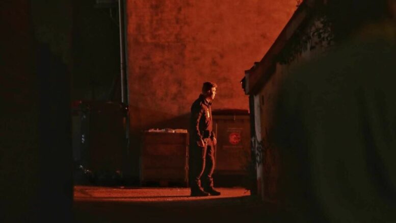 Kvinde i håndklæde jagtet af betjent gennem byen