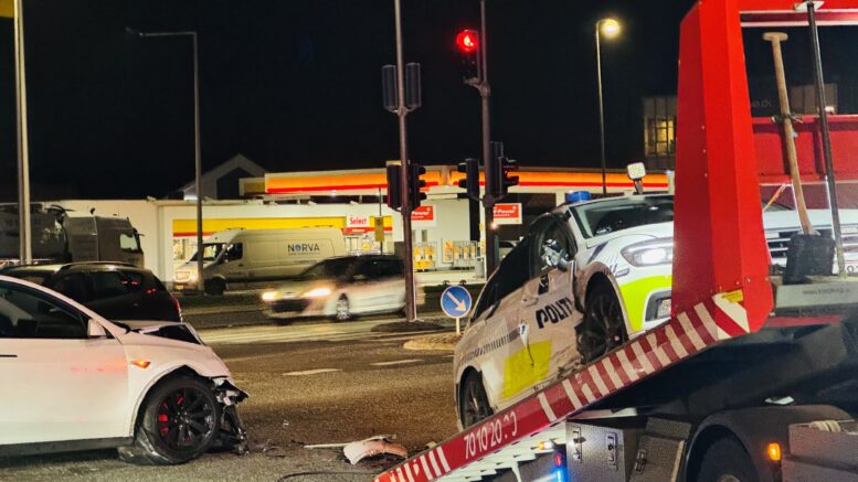 Politibil i fuld udrykning og Tesla brager sammen i lyskryds
