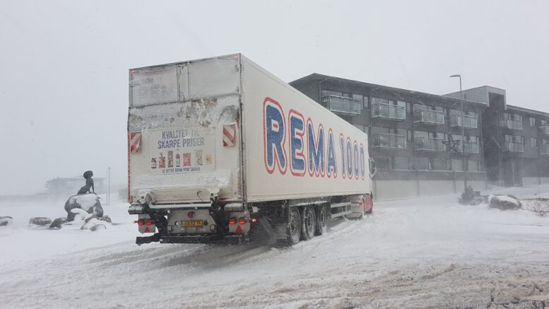 Lastbil sidder fast i rundkørsel ved Rema 1000