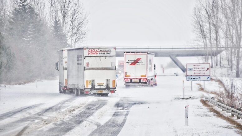 Kaos på bakke ved hovedvej: Lastbiler sidder fast
