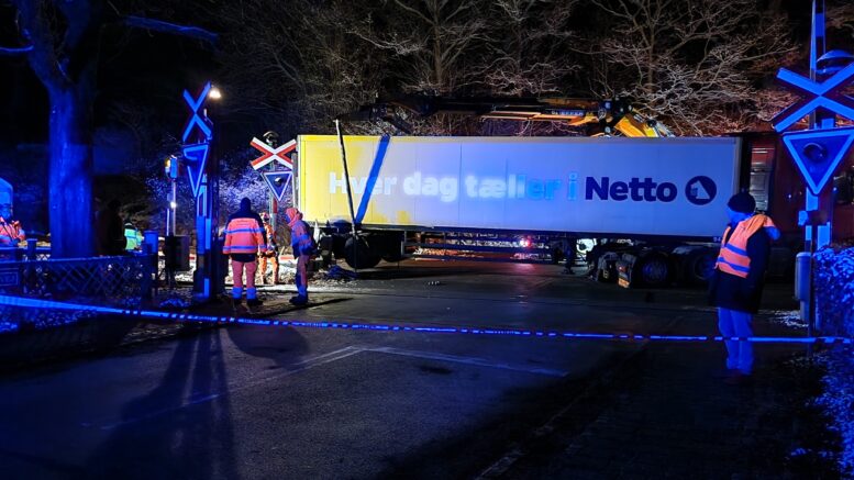 Lastbil sidder fast på skinnerne ved jernbaneoverskæring