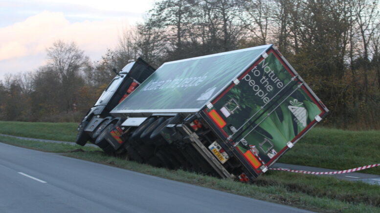 Lastbil væltet ned i grøft