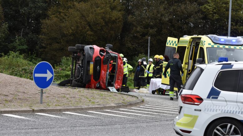 Chauffør fastklemt i væltet varevogn efter uheld i rundkørsel