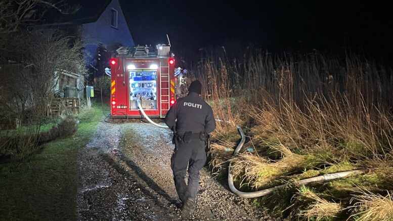 Brand i hus: Brandvæsnet hejser stige op til taget