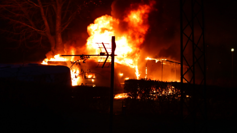 Campingvogn ædt op af flammer på campingplads