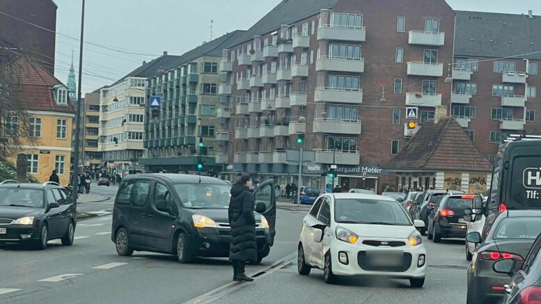 Færdselsuheld på travl vej: To biler holder midt på vejen