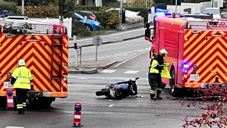Motorcyklist og bilist i færdselsuheld midt i vejkryds