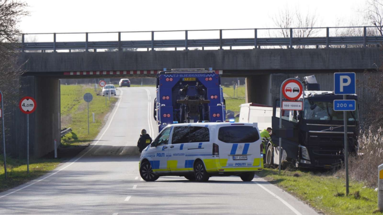Lastbil påkører motorvejsbro: Chauffør tilset af ambulance
