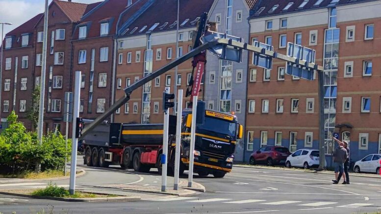 Lastbil med kran ramte skilte: Vej er spærret!
