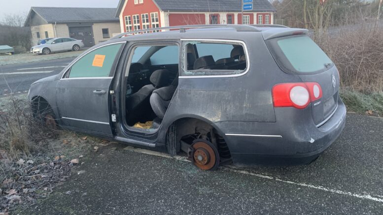 Se billederne: Bil ved Fredericia mangler dør, rat og hjul