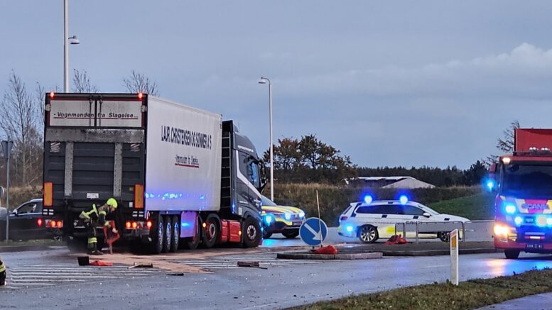 Lastbil og personbil stødt sammen: Lastbilen spærrer vejen