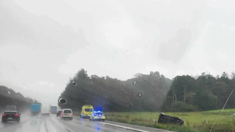 Færdselsuheld på motorvejsrampe: Bil er endt på siden!