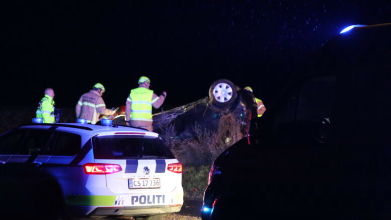 Soloulykke nær Aarhus – bil ligger på taget