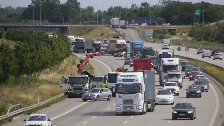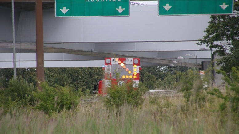 Motorvejsspor spærret efter uheld: Lastbil og skiltevogn involveret