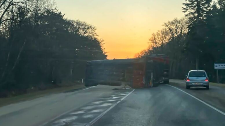 Totaltspærret: Væltet lastbil ligger på tværs af vejen
