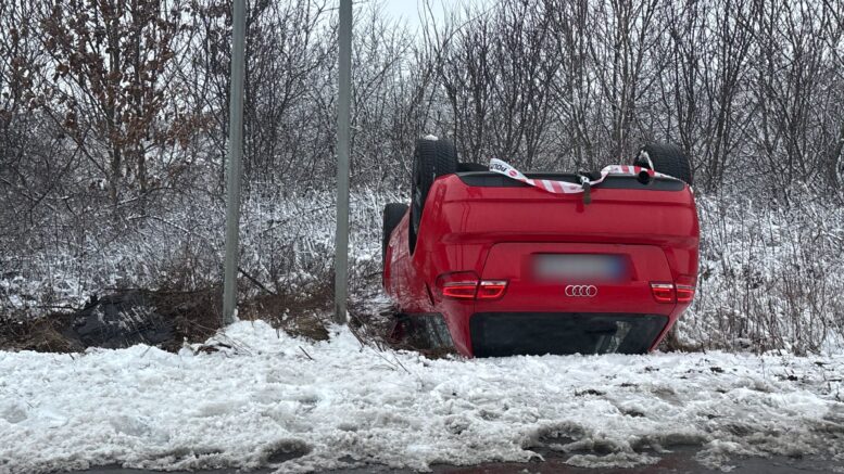 Gik helt galt på de glatte veje: Bil ender på taget i grøft