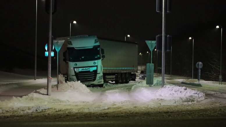 Gav op i sneen: Lastbil efterladt på tværs af vej