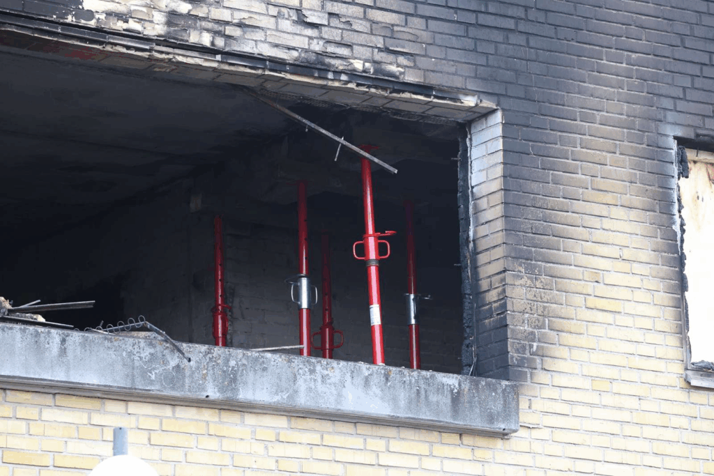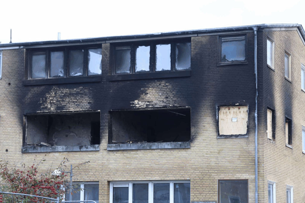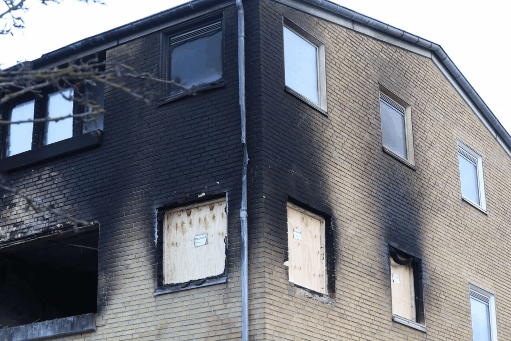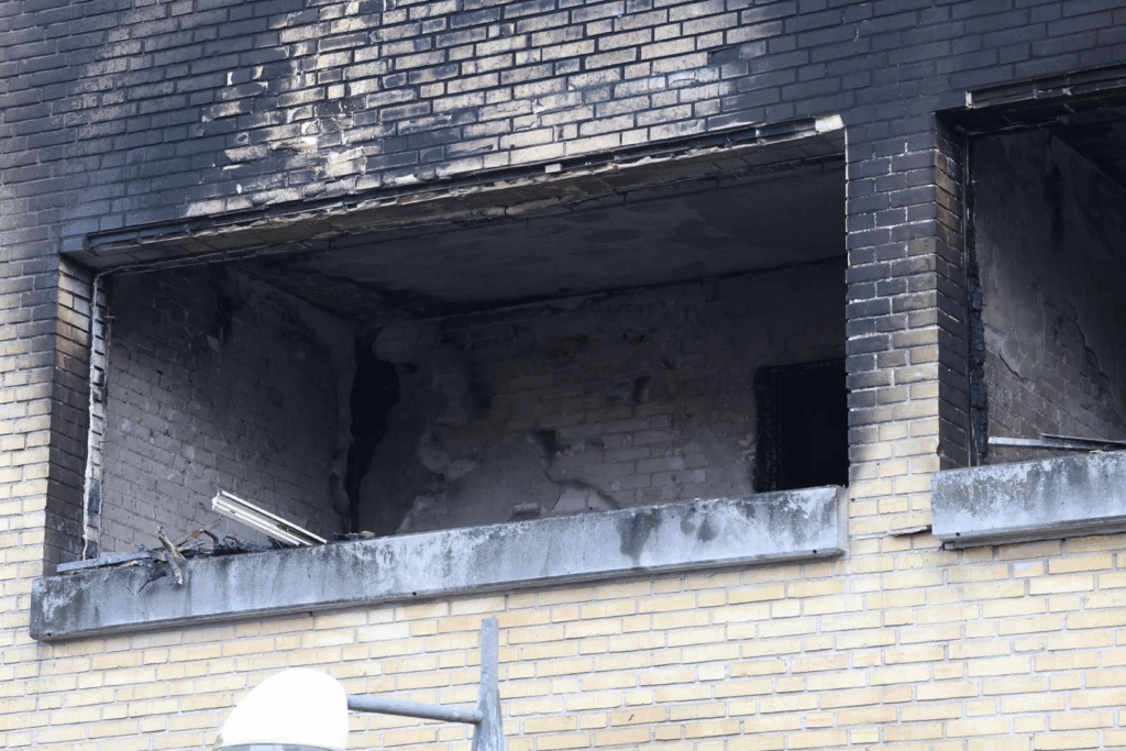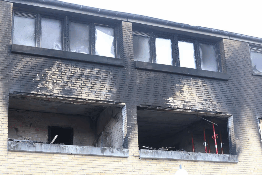 Store områder på den gule murstensbygning er dækket af sod, steder hvor der tidligere var ruder er nu helt blottede, mens andre vindueshuller er lukket af træplader.