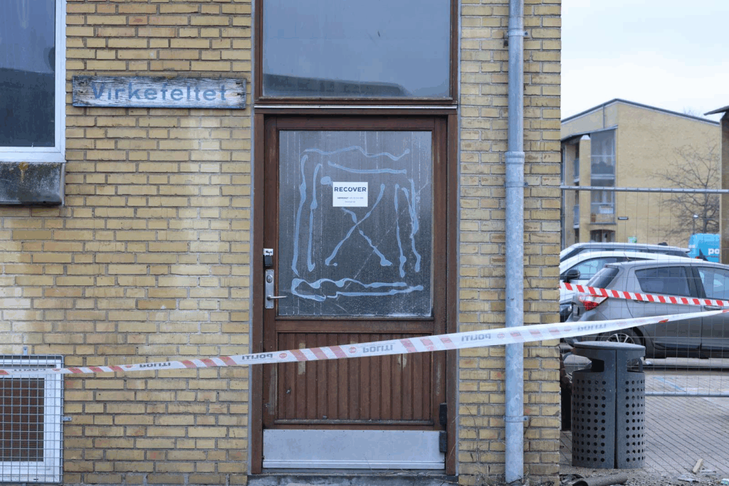 På Virkefeltet, der ligger i den københavnske bydel Tingbjerg, er en opgang fortsat afspærret af politiets afspærringsbånd. På døren sidder et klistermærke fra skadeservicevirksomheden Recover.