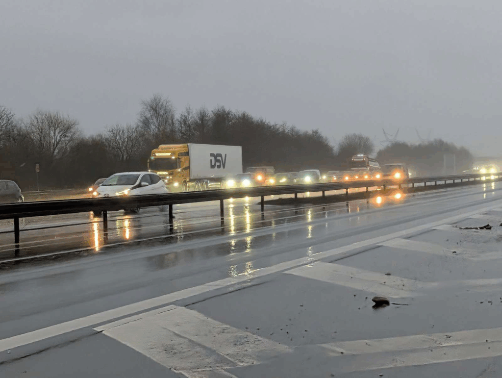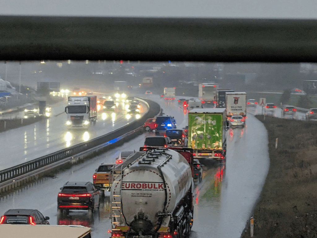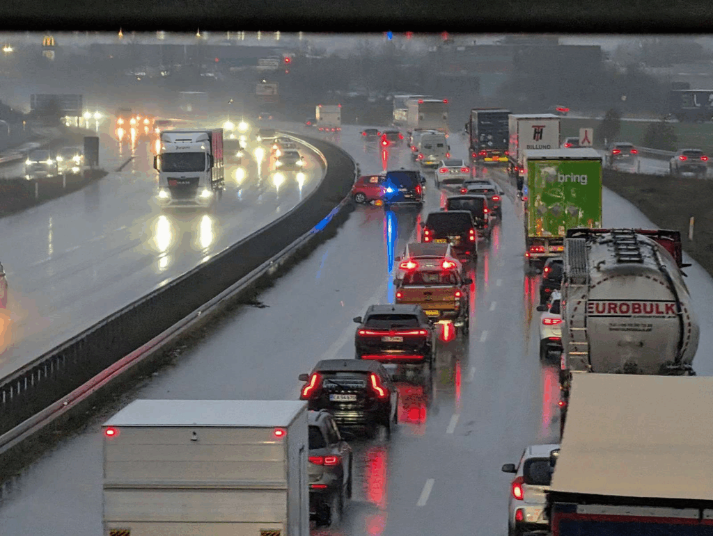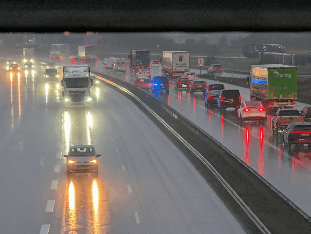 ‘Redning er på stedet’: Uheld i myldretiden på sjaskvåd motorvej