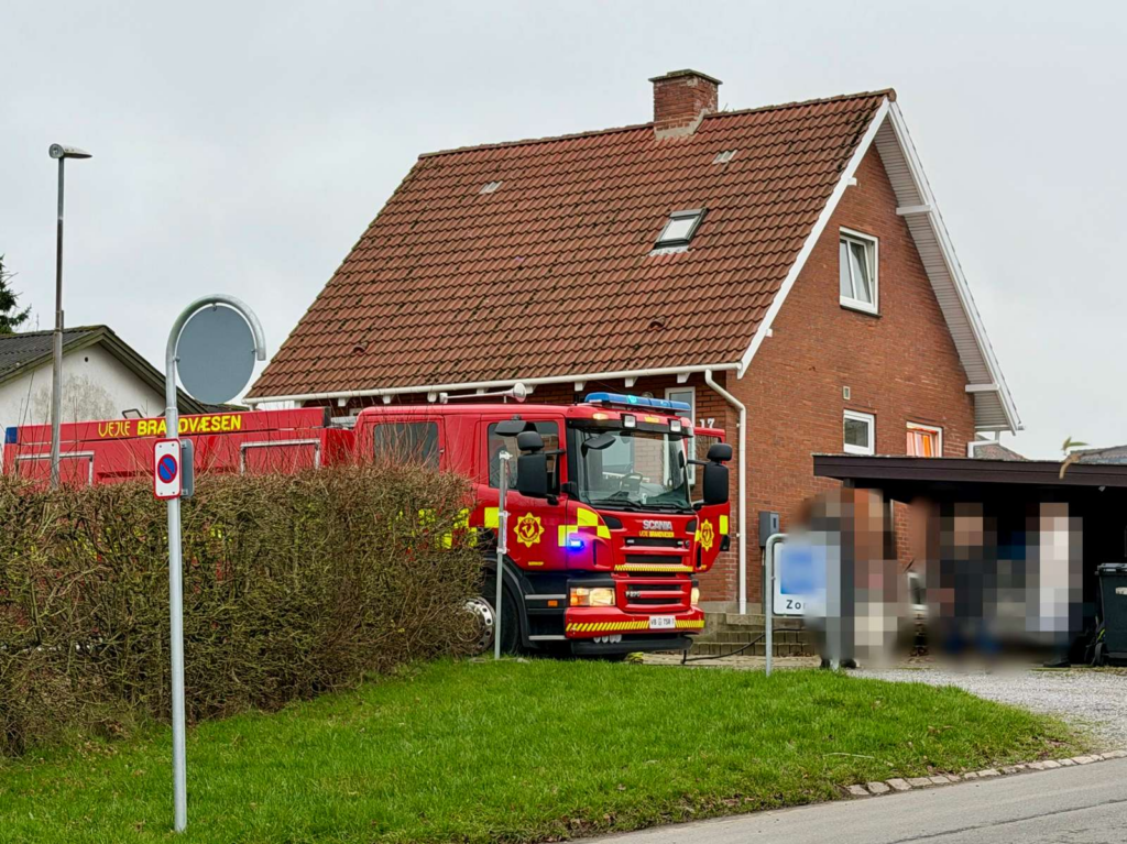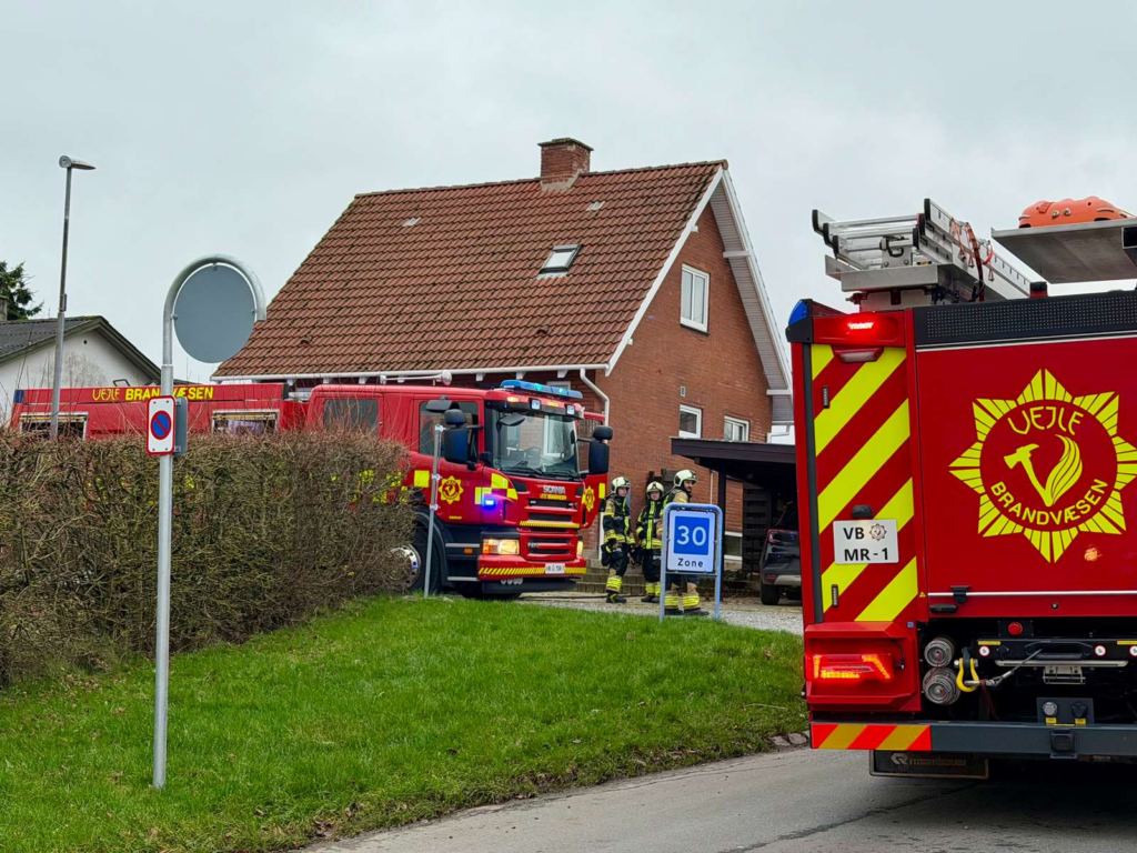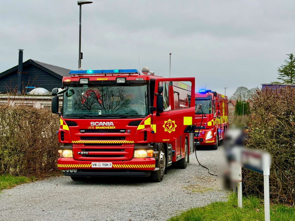 På Dr. Friesvej i Børkop, hvorfra brandmeldingen er kommet ind, kan brandfolk ses udrulle brandslanger i bekæmpelsen på branden.