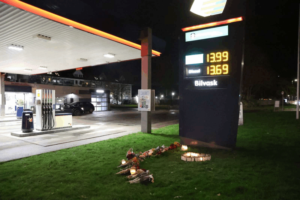 Hvor der fredag var blå blink, politiafspærringer og hektisk aktivitet, er der nu roligt. Kun lyset fra flimrende stearinlys bryder mørket, og duften af blomster hænger i luften mellem benzinpumperne. Venner, familie og lokale har i løbet af aftenen lagt buketter, lys og små kort for at mindes den dræbte mand.