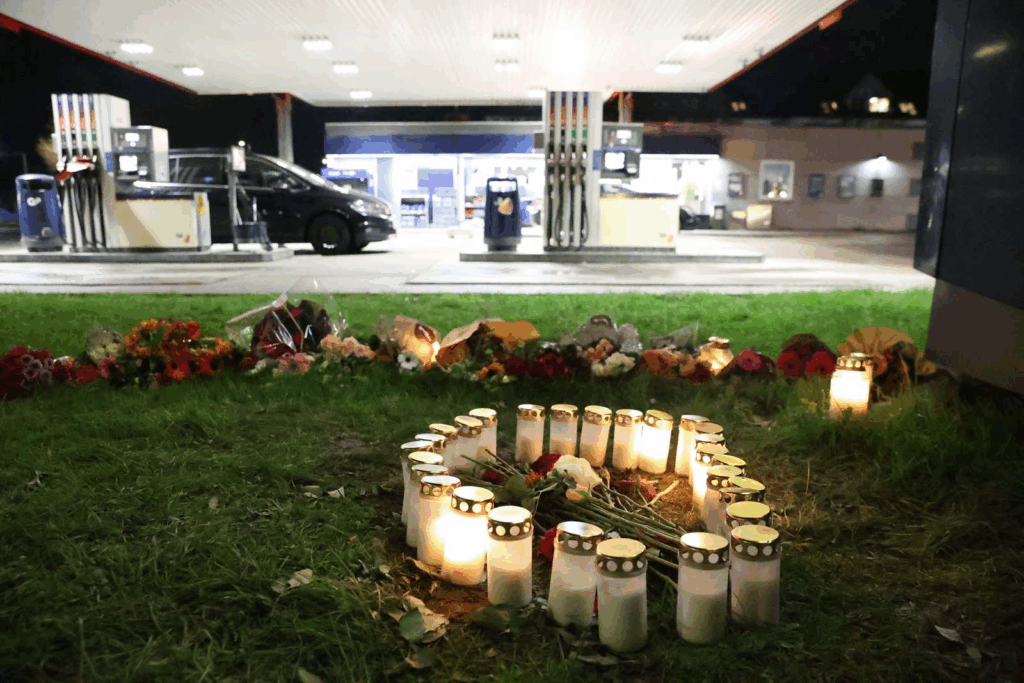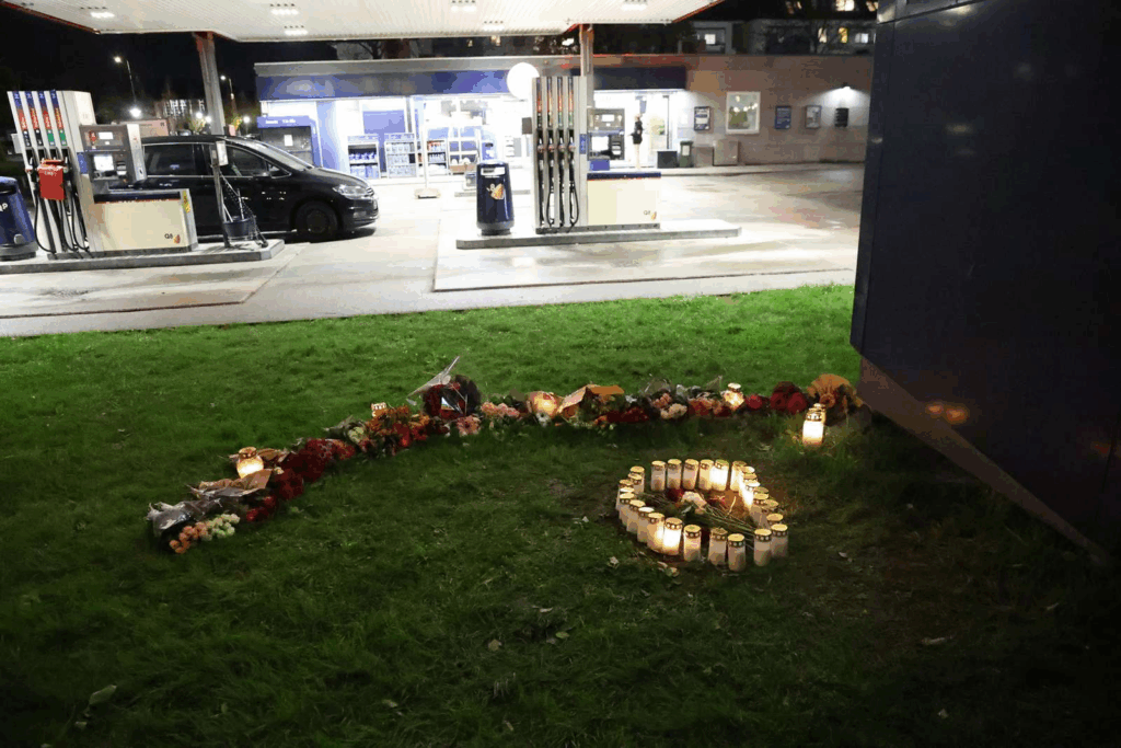 Selv om sagen fortsat efterforskes intenst, og motivet endnu er uklart, står det lille hjørne ved tankstationen nu som et stille mindested.