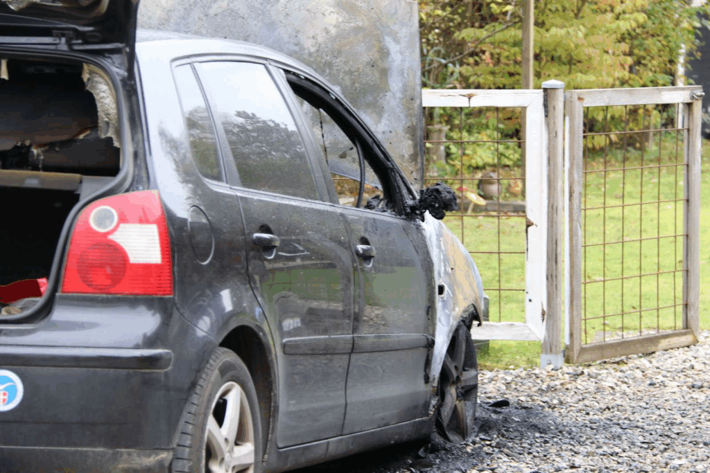 Billeder fra stedet viser den sorte bil, der holder i en indkørsel. Køretøjet er kraftigt brandskadet på fronten, hvor også dækkene er smeltet.