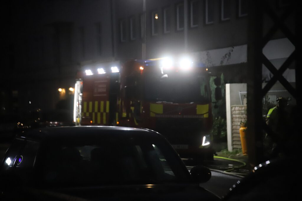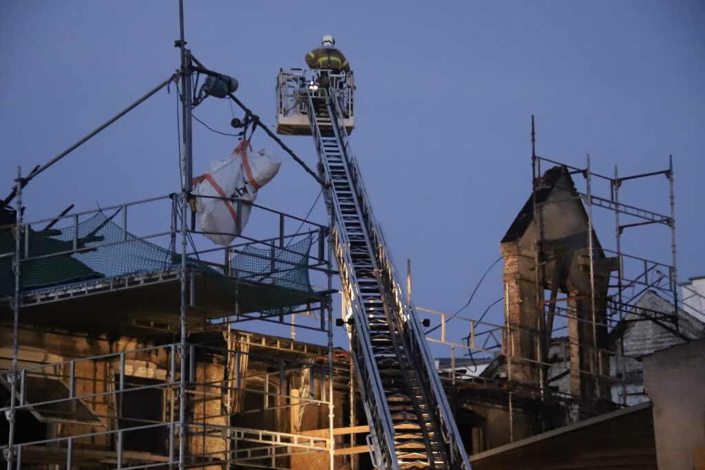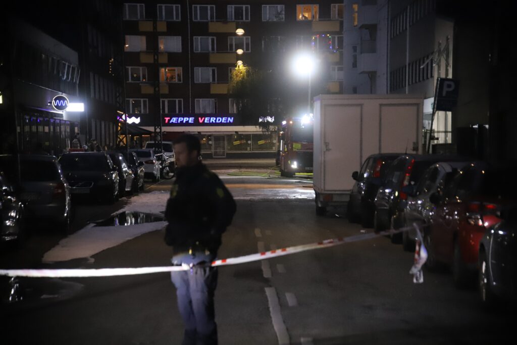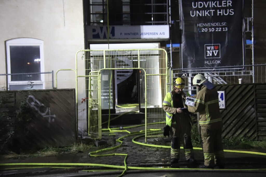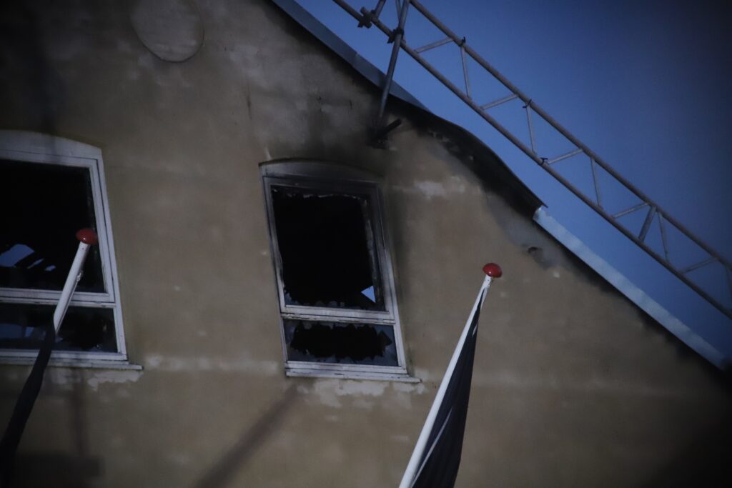 Lørdag aften er beredskabet stadig i gang i området, hvor man tydeligt kan se spor efter flammerne på bygningen.