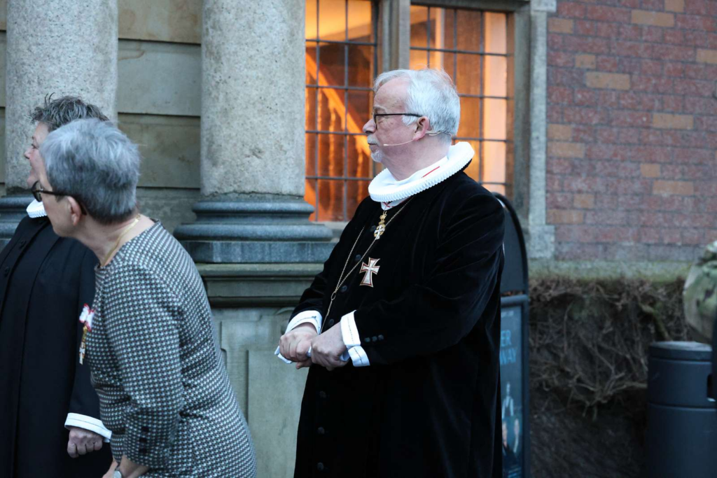 Foran kirken hilste Kongeparret blandt andre på biskop Peter Skov-Jakobsen.