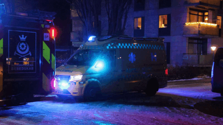 Ambulancer og akutlægebil til stede nær torv