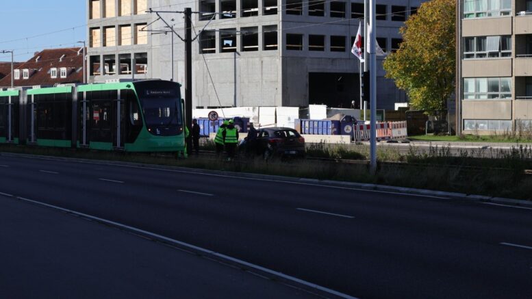 Tæt på katastrofe: Bil kører ud på togskinnerne
