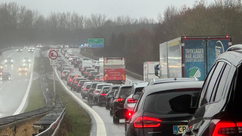 Massiv kø på motorvej: Det flyder med vragdele på kørebanen