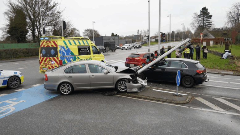 Kaos i kryds: Biler brager sammen og vælter lyskurv