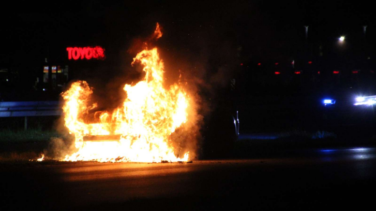 Køretøj i voldsomme flammer på landevej