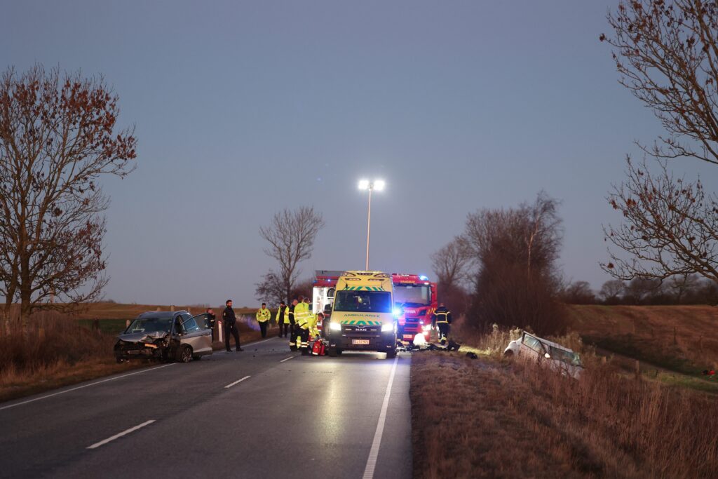 Her er flere biler umiddelbart braget sammen, hvorfor et køretøj nu holder i en grøft, mens et andet holder på vejen med voldsomme skader.