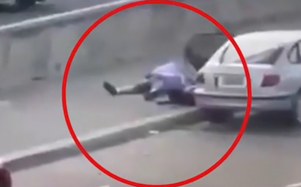 På optagelsen, som er offentliggjort af bilisten, kan man se, at den 69-årige Boris Gurman og den 50-årige Sajid Akram – som er udpeget som én af to gerningsmænd – begge falder mod asfalten bag en parkeret bil.